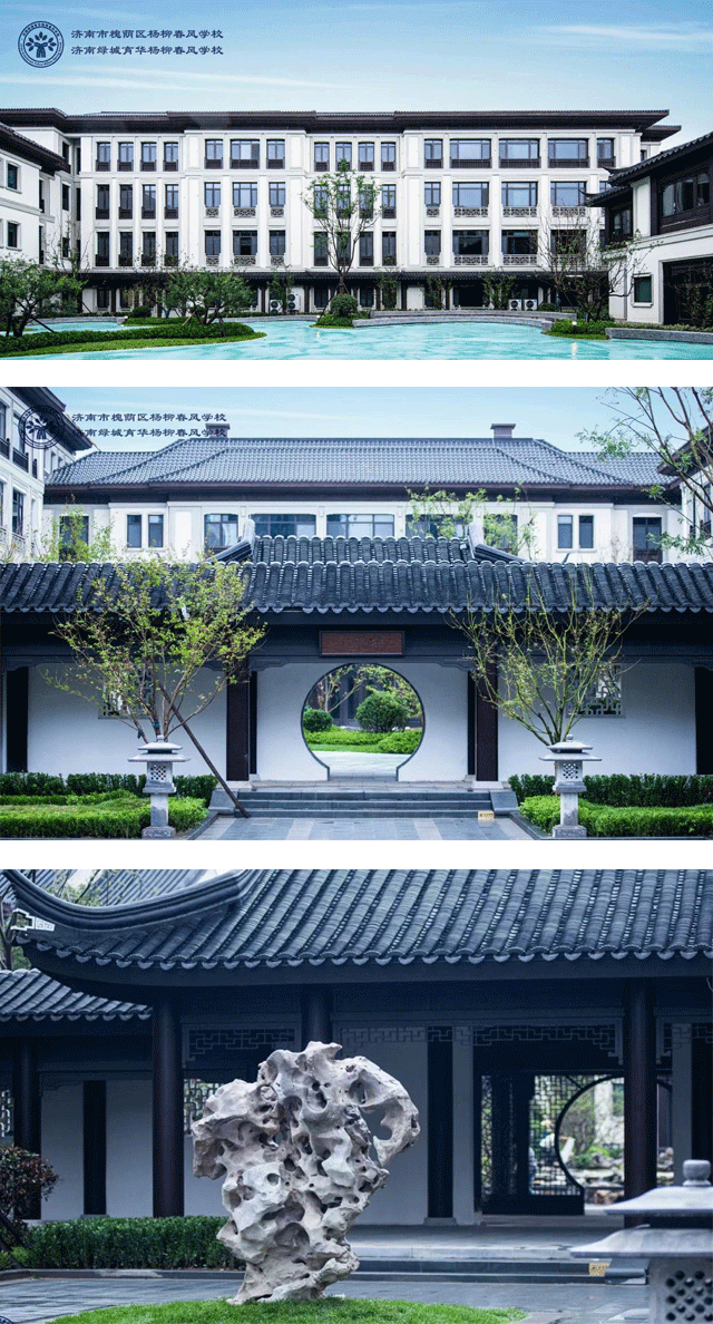 學(xué)校以“濟(jì)南府學(xué)文廟院”為主題進(jìn)行景觀設(shè)計(jì),米黃色的墻面、灰色瓦屋頂,利用高低錯(cuò)落的建筑組成豐富校園景觀;廣闊的綠茵場(chǎng),古典的樓閣臺(tái)榭,高大的體育館等。所有建筑錯(cuò)落有致,碧水藍(lán)天,綠樹(shù)成蔭,校室縱橫,校園風(fēng)景美麗如畫(huà)。典雅的色調(diào),明亮的教室,嶄新的桌椅,沒(méi)有一樣不是精心打造配置,沒(méi)有一樣不是人性化的杰作;甚至連每一棵花草樹(shù)木,都是特意設(shè)計(jì)栽培,寓意深遠(yuǎn)。