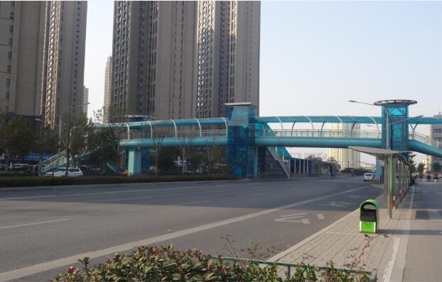 該工程分別位于經(jīng)二路和經(jīng)五路南側(cè),橫跨緯十二路,行人過(guò)街需求量大,設(shè)置人行天橋,以改善道路交通環(huán)境,提高出行的便利。兩座過(guò)街天橋共設(shè)置6部專(zhuān)用垂直電梯,這是濟(jì)南首例過(guò)街天橋垂直電梯,其中橋體中間電梯單側(cè)開(kāi)門(mén),為BRT公交專(zhuān)用。橋體兩頭電梯前后兩側(cè)開(kāi)門(mén),為老、弱、病、殘、孕等特殊人群的出行提供了方便。